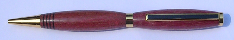 I turn these pens on a lathe and then sand and polish them. I use premium pen hardware that is plated in 24k gold and is compatible with Cross® refills. The clip has a nice black stripe. I use many types of exotic woods from around the world. Take a look below for some examples of my pens.